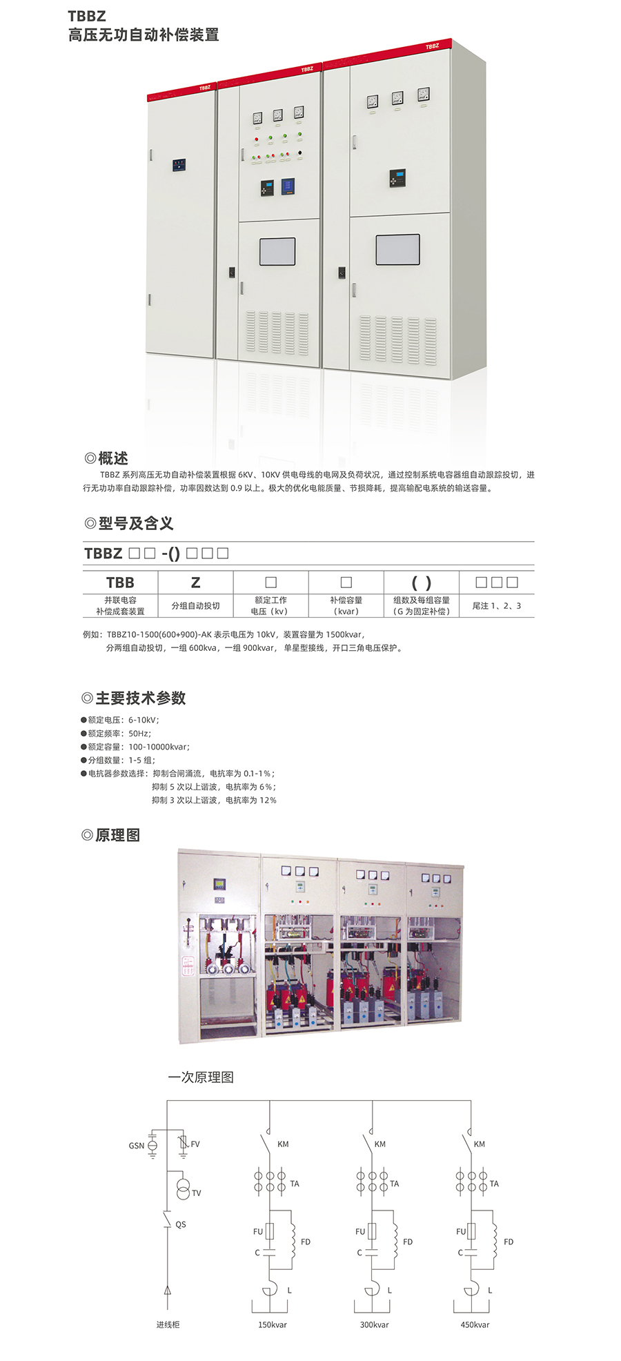 TBBZ系列高壓無功自動補(bǔ)償裝置根據(jù)6KV、10KV供母線的電網(wǎng)及負(fù)荷狀況,通過控制系統(tǒng)電容器組自動跟蹤投電切,進(jìn)無功功率自動跟蹤補(bǔ)償,功率因數(shù)達(dá)到0.9以上。優(yōu)化電能質(zhì)量、節(jié)損降耗,提高輸配電系統(tǒng)的輸送容量。型號含義例如:TBBZ10-1500(600+900)-AK表示電壓為10kV,裝置容量為1500kvar,分兩組自動投切,一組600kvar,一組900kvar,單星型接線,開口三角電壓保正常使用