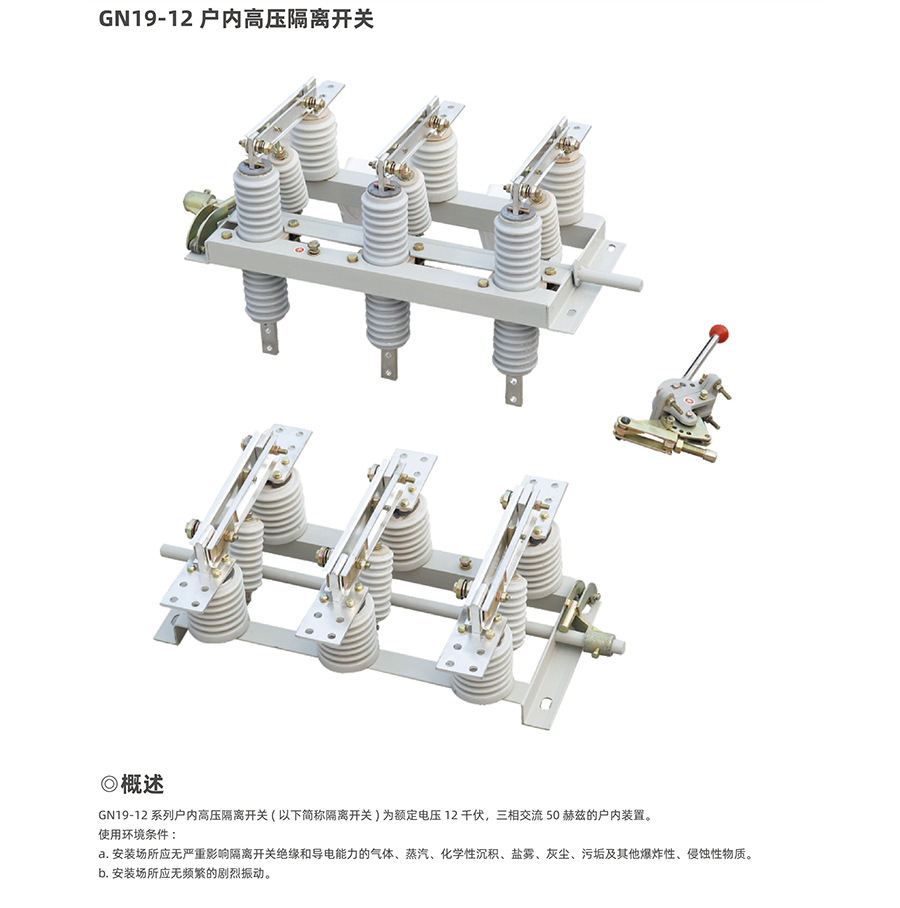 GN19-12M型系列戶內(nèi)高壓隔離開關(guān)系高壓開關(guān)設(shè)備,用于額定電壓12KV,交流50Hz及以下電力系統(tǒng)中,配用CS6-1型人力操作機(jī)構(gòu),作為有電壓而無負(fù)載的情況下,分、合電路之用,亦有派生產(chǎn)品防污型、高原型的和加裝帶電顯示裝置等。