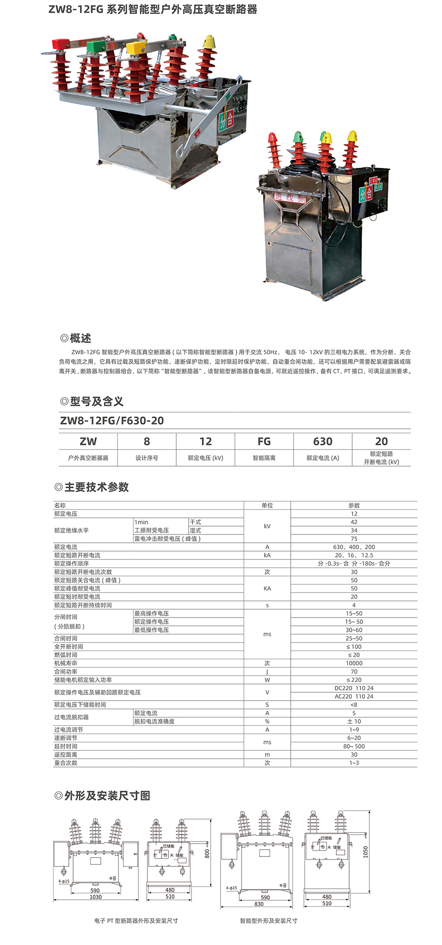 ZW8-12F(G)智能型戶外高壓真空斷路器(以下簡(jiǎn)稱智能型斷路器)用于交流50Hz、電壓10-12kV的三相電力系統(tǒng),作為分?jǐn)唷㈥P(guān)合負(fù)荷電流之用,它具有過載及短路保護(hù)功能、速斷保護(hù)功能、定時(shí)限延時(shí)保護(hù)功能、自動(dòng)重合閘功能,還可以根據(jù)用戶需要配裝避雷器或隔離開關(guān)(即斷路器與隔離開關(guān)組合,以下簡(jiǎn)稱“ 組合智能型斷路器”等。該智能型斷路器自備電源,可就近遙控操作,備有CT、PT接口,可滿足遙測(cè)要求。