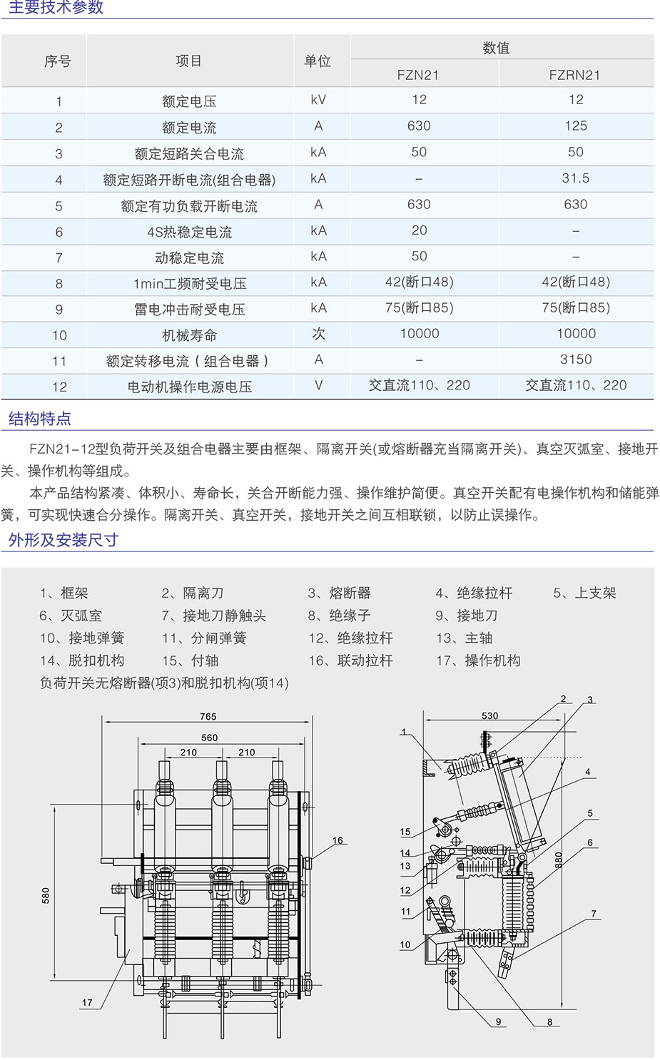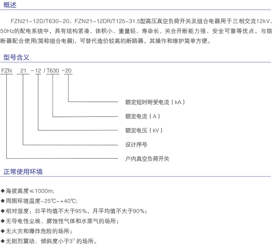 FZN21-12D/T630-20、FZN21-12DR/T125-31.5型高壓真空負荷開關及組合電器用于三相交流12kV,50Hz的配電系統(tǒng)中,具有結(jié)構(gòu)緊湊、體積小、重量輕、壽命長、關合開斷能力強、安全可靠等優(yōu)點,與熔新器配合使用(簡稱組合電器),可替代造價較高的斷路器,其操作和維護簡單方便。