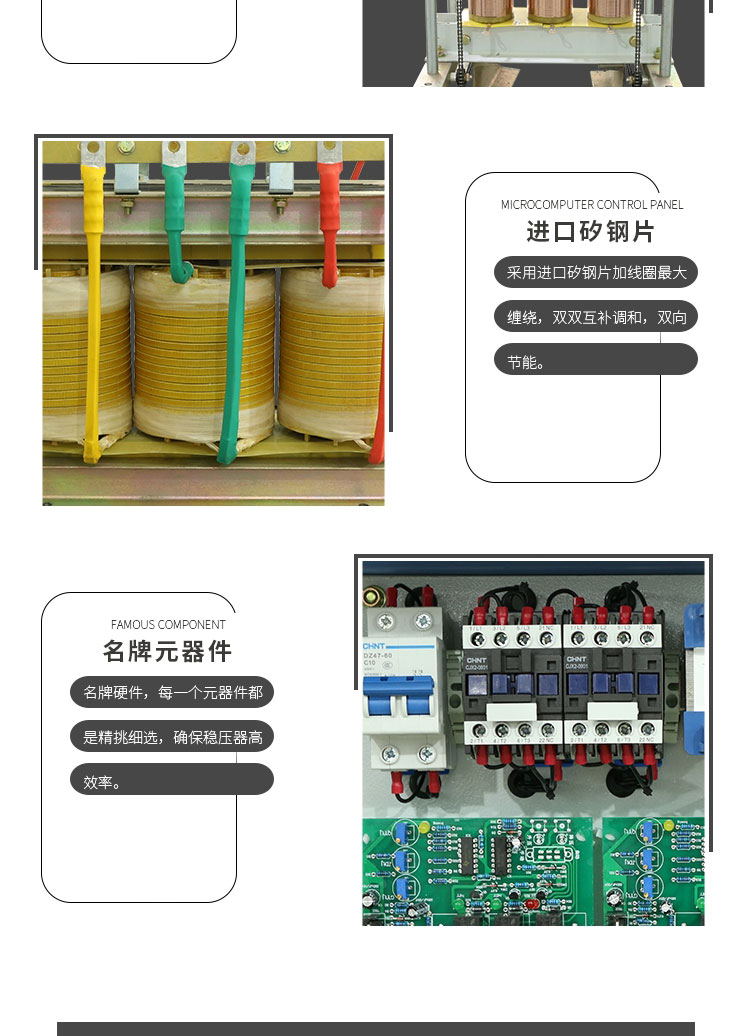 穩(wěn)壓器是一種能自動調整輸出電壓的供電電路或供電設備,其作用是將波動較大和達不到電器設備要求的電源電壓穩(wěn)定在它的設定值范圍內,使各種電路或電器設備能在額定工作電壓下正常工作。 ZUI初的電力穩(wěn)壓器是靠繼電器的跳動穩(wěn)定電壓的。當電網電壓出現(xiàn)波動時,電力穩(wěn)壓器的自動糾正電路啟動,使內部繼電器動作。迫使輸出電壓保持在設定值附近,這種電路優(yōu)點是電路簡單,缺點是穩(wěn)壓精度不高并且每一次繼電器跳動換擋,都會使供電電源發(fā)生一次瞬時的中斷并產生火花干擾。 這對電腦設備的讀寫工作干擾很大,容易造成電腦出現(xiàn)錯誤信號,嚴重時還會使硬盤損壞。 高質量的小型穩(wěn)壓器,大多采用電機拖動碳刷的方法穩(wěn)定電壓,這種穩(wěn)壓器對電器設備產生的干擾很小穩(wěn)壓精度相對較高。