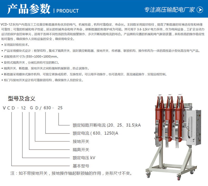YNZN19-12GD,VCD-12GD系列隔離接地一體式戶內(nèi)高壓三工位真空斷路器具有優(yōu)良的電氣、機(jī)械性能,機(jī)構(gòu)可靠穩(wěn)定、壽命長(zhǎng)。三工位真空斷路器集真空斷路器、隔離開關(guān)、接地開關(guān)電流互感器、傳感器于一體;產(chǎn)品設(shè)計(jì)為側(cè)裝式產(chǎn)品,符合小型化的趨勢(shì),適配柜體尺寸為(450×1000×1800)與(520×1000×2000)。相比傳統(tǒng)高壓固定式開關(guān)柜XGN2或GN66,KYN28等,在成套廠內(nèi)需要分別單獨(dú)安裝隔離開關(guān)、真空斷路器、接地開關(guān)、電流互感器、傳感器,安裝調(diào)試機(jī)械連鎖,工藝復(fù)雜、耗工時(shí)大、對(duì)工人技術(shù)要求高,使用該產(chǎn)品后、配多功能真空斷路器,開關(guān)本體具有隔離工位、斷路器工位、接地工位更加集成化、系統(tǒng)化,安裝簡(jiǎn)單、快捷、方便、可靠。主回路采用固封極柱,提高了斷路器的環(huán)境適應(yīng)性和絕緣可靠性;可靠的機(jī)械和電子性能,延長(zhǎng)的機(jī)械壽命和電子壽命,使斷路器的免維護(hù)成為可能。