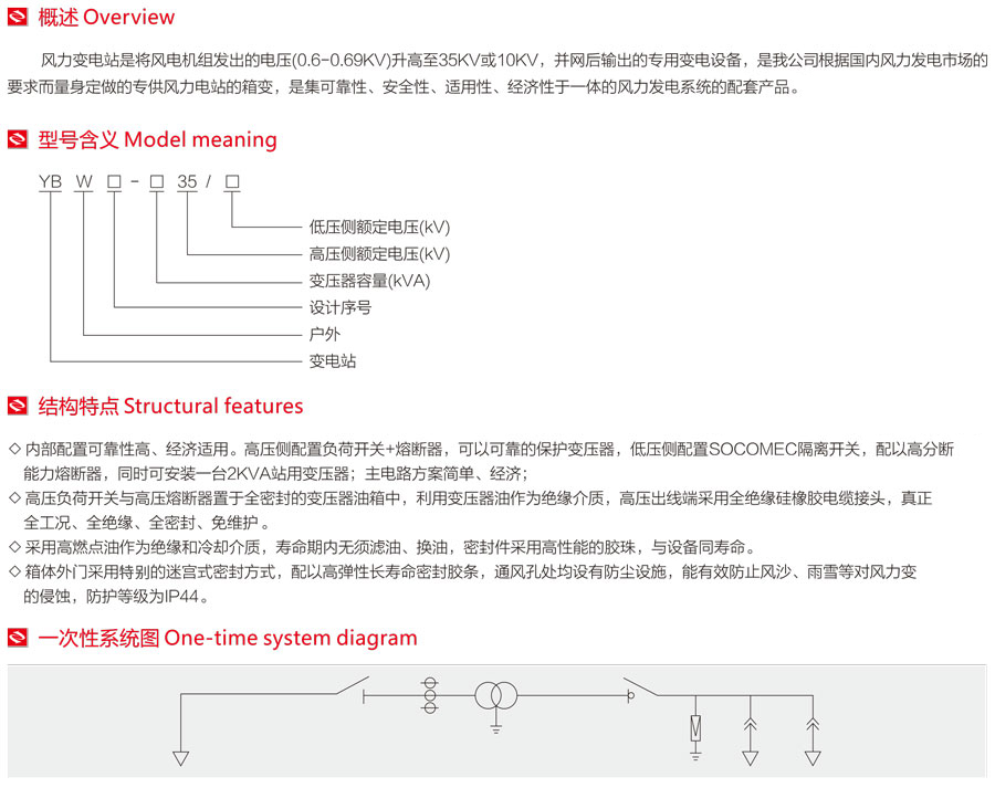 風(fēng)力變電站是將風(fēng)電機組發(fā)出的電壓(0.6-0.69KV)升高至35KV或10KV,并網(wǎng)后輸出的專用變電設(shè)備,是我公司根據(jù)國內(nèi)風(fēng)力發(fā)電市場的要求而量身定做的專供風(fēng)力電站的箱變,是集可靠性、安全性、適用性、經(jīng)濟性于一體的優(yōu)良的風(fēng)力發(fā)電系統(tǒng)的配套產(chǎn)品。